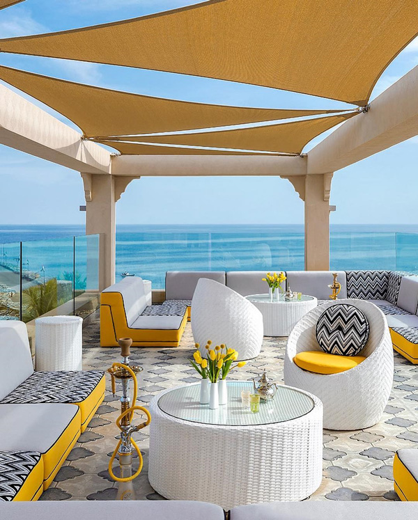 其次,酒店的海景房除了室內的設計,室外肯定也是要花費心思的,我們可以室外做些延伸的露臺,讓客人可以在戶外直接感覺海風的清涼。室外露臺的話可以做一些景觀的設計,設計成一個小的私家花園的感覺,再在中間設計一個符合意境的餐桌,這樣客人可以一邊品嘗美味佳肴,一邊欣賞絕世海景。
