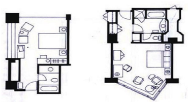 大床間配備一張雙人床。這種客房較適合夫婦旅行者居住,也適合商務(wù)旅行者單人居住。由于雙人床間的起居空間相對比較大,酒店常根據(jù)需要,撤走起居區(qū)的家具再布置一張床,以適合夫妻帶小孩出游的客源居住。這樣也既體現(xiàn)了動態(tài)空間的設(shè)計(jì)理念,又適用了市場需求,增強(qiáng)了酒店的競爭力,如圖1所示。