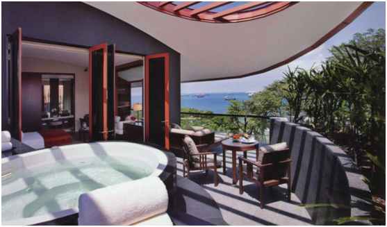 客房室內(nèi)空間向外延伸至陽臺部分,使客人可以更好地親近大自然