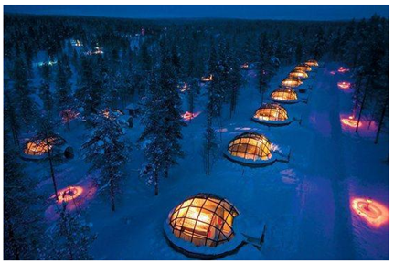 在芬蘭有這樣一家非常有特色酒店——Kakslauttanen(卡克斯勞坦恩)旅館,整個旅店的風格打造成小村部落,并擁有25個頂級木屋別墅,冰雪酒店和世界最大的冰雪餐廳(可容納150人)。村中20個玻璃穹頂客房(Igloo)共有40個床位,專為夜間欣賞北極光和午夜太陽而建,這個地區(qū)的燈光很少,極適合觀測璀璨的群星和北極光。據(jù)說這些玻璃幕墻都采用了特殊的設計,即便窗外溫度低到零下30攝氏度,室內(nèi)仍然可以保持溫暖如春,而且不會結(jié)霧而影響探尋的視線。