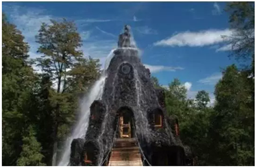 Huilo Huilo是屬于私人擁有的自然保護區(qū),這里有座智利最好的酒店之一:魔術山旅館(Magic Mountain Lodge) 。這是座看起來如同火山般的建筑,只不過在這山頂噴涌而出的不再是熾熱熔巖、而是清涼的瀑布,但是,如果你對真火山感興趣,也可以在這里遠望到壯觀的阿雷納火山。這家智利的魔術山旅館,房間就在一個瀑布下面,旅客借由一個吊橋進出,好像住在水簾洞一樣。13個房間每個都有獨立洗浴間。此外,還有11間小屋,每間能容納4-6人。